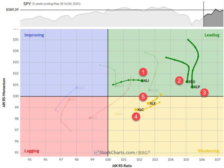 Consumer Staples have made a considerable leap, landing deep in the improving quadrant with the highest RS-Momentum reading. This surge explains its return to the top 5. Utilities isn’t far behind, also making a strong move into the improving quadrant. Financials, while in the lagging quadrant, are showing less dramatic movement compared to staples and utilities. Its shorter tail on the RRG indicates a less powerful move, but its high position on the weekly RRG is keeping it in the top 5 — for now.